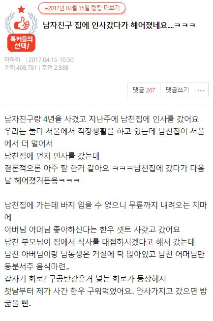 “남자친구 집에 인사 갔다가 헤어집니다” 애인의 집을 방문하는건 매우 떨리는 일이다. ADVERTISEMENT 과거 온라인 커뮤니티에는 4년을 사귄 남자친구 집에 인사갔다가 헤어진 사연이 화제를 모았다. ADVERTISEMENT 온라인 커뮤니티 ADVERTISEMENT 소오름…. 진짜 큰일날뻔…ㅠㅠ