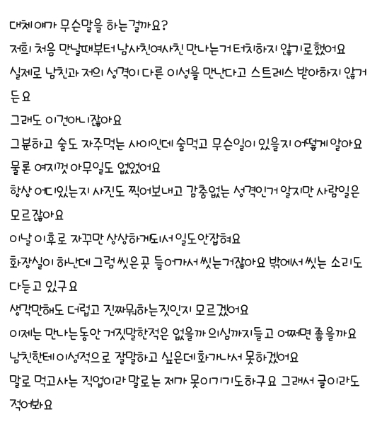 A씨는 “남친과 처음 만날 때부터 남사친 여사친 만나는 건 터치하지 않기로 했다. 지금까지는 아무 일도 없었지만 술먹고 무슨 일이 있을지 어떻게 아냐”고 토로했다.