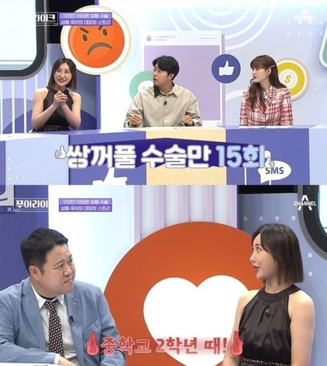 이어 “중학교 2학년 때 처음으로 쌍꺼풀 수술을 했다. 현재까지 쌍꺼풀을 포함한 눈 수술만 15회를 했다”며 “다른 성형 수술만 30회, 시술을 포함하면 총 40회를 진행했고 비용은 6500만 원이 들었다”고 전했다.