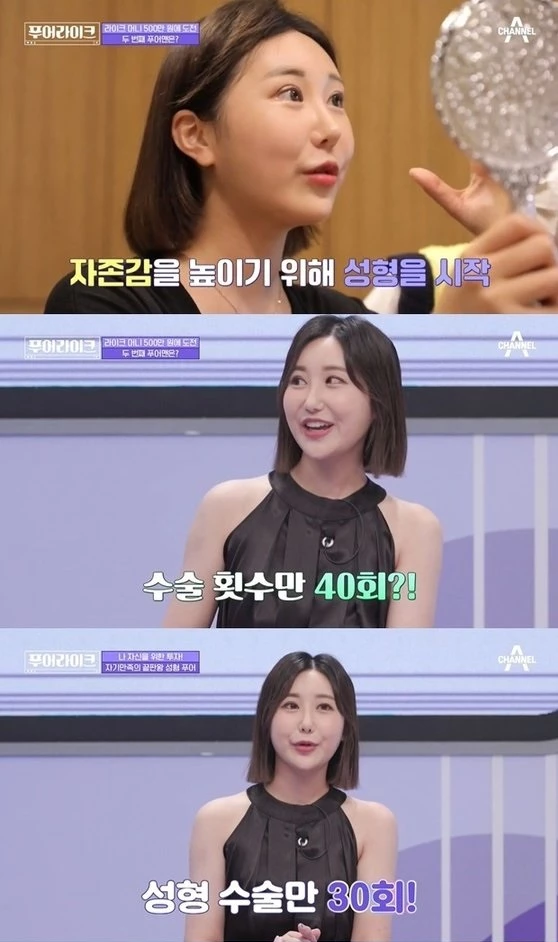 지난 12일 방송된 채널A ‘푸어라이크’에는 성형 수술 및 시술만 40번을 진행하며 6500만 원을 쓴 양혜정 씨가 출연해 “성형 수술을 시작한 이유는 낮은 자존감을 회복하기 위해서”라며 “학창 시절에 또렷한 쌍꺼풀이 유행이었는데 쌍꺼풀 액이나 테이프로 인위적으로 만들다 보니 피부가 늘어져 ‘이럴 바에는 수술을 하자’는 생각이 들었다”고 말했다.