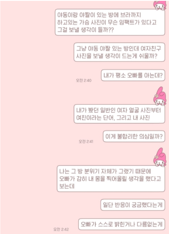 당시 남자친구는 그냥 야.동만 있는 방에 반응이 궁금해서 내 몸 사진을 보낸 것이라며 경찰에서 남자친구 핸드폰 디지털 포렌식한다고 가져오라고 했지만 남자친구가 하수구에 몰카가 담긴 핸드폰을 버려서 증거가 인멸됐다고 한다.