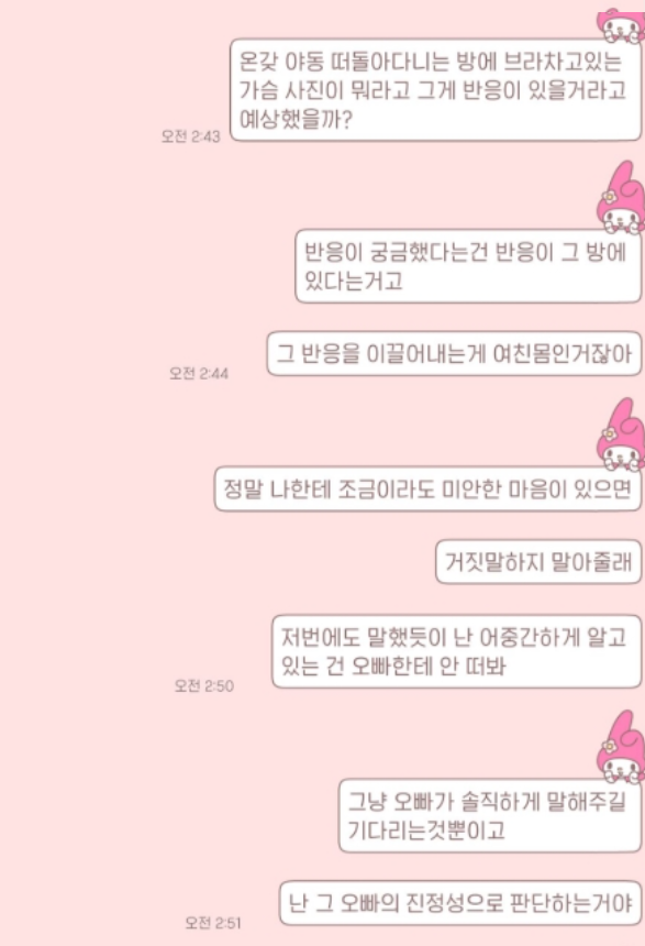 끝으로 글쓴이는 “남친이 순수하게 인정해서 의아해하는 애들도 많을 것 같은데 몇 주 전부터 남친한테 나는 그래도 오빠 좋다고 다만 솔직하게 털어놨으면 좋겠다고, 숨기는거 없었으면 좋겠다고 하면서 계속 구슬렸어. 뭐든 용서하고 이해할 수 있는 것처럼”이라며 “조금씩 실토하게 만든거야”라며 글을 마쳤다.