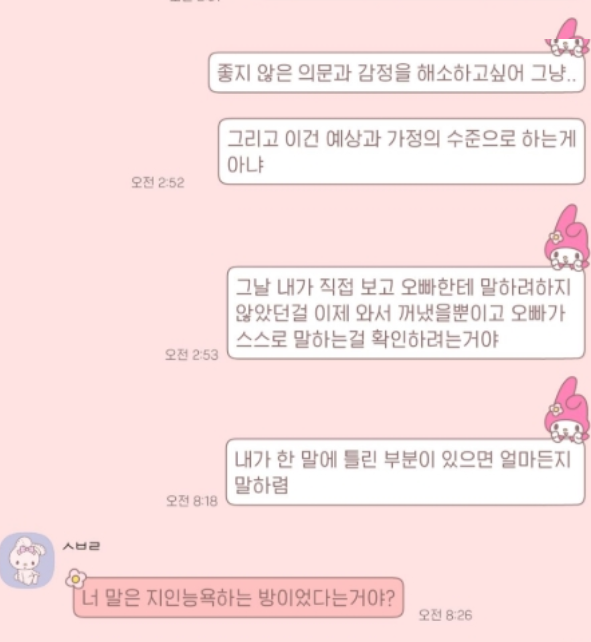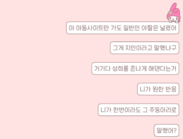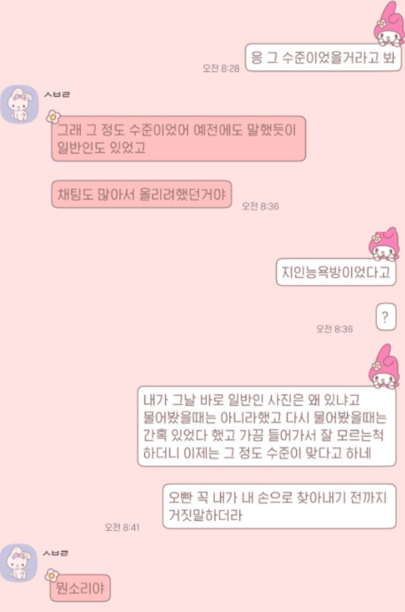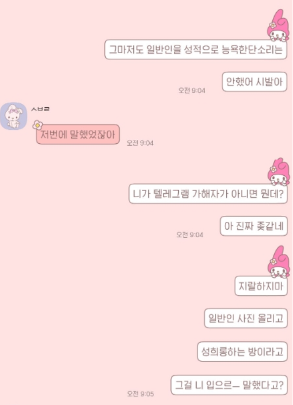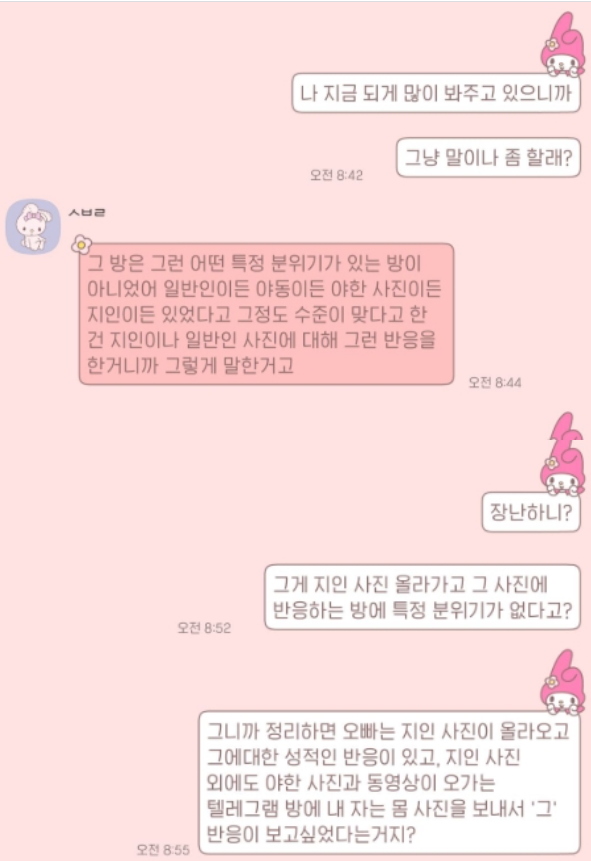 A씨는 “이번에 지인능욕방이라는거 알게됐는데 딱 느낌이 오더라고 그 방이었다는게.. 그래서 카톡해봤는데”라고 했다.