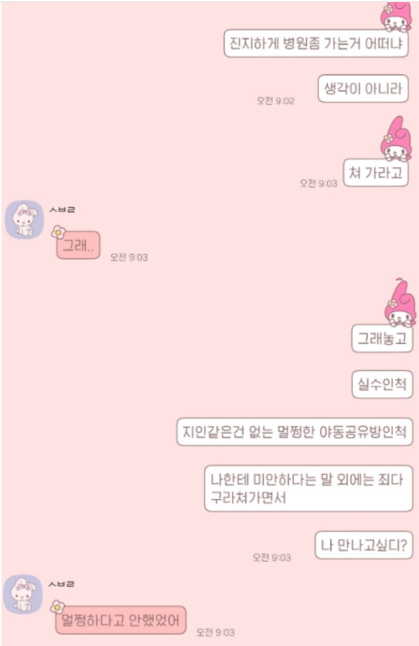 이어 “중간에 내가 잠에서 깼는데 화면에 빨간 주무늬 옷 입은 일반인 여자랑 여친이라는 단어가 보이더라. 폰 뺏어서 나왔어야 했는데 남친 키가 180이 넘어 제압당하면 답도 없을 것 같아서 일단 도망나와서 경찰에 신고했어. 지금은 검찰에 송치된 상태야”라고 상황을 알렸다.