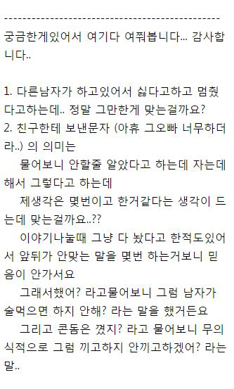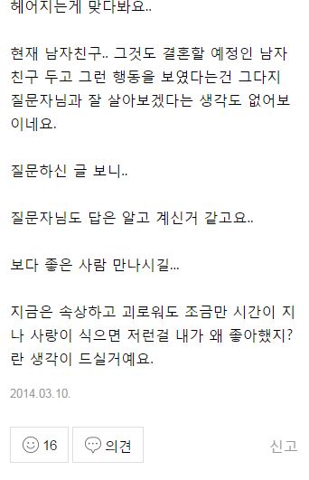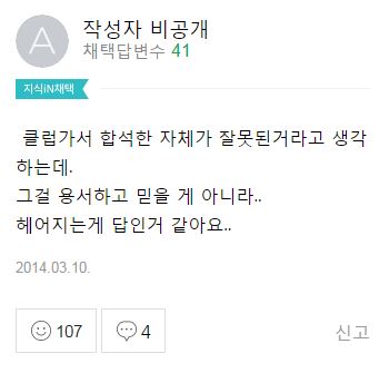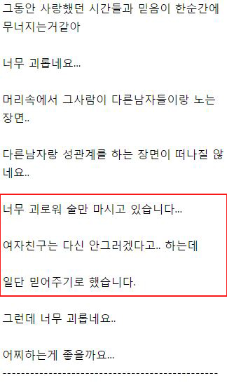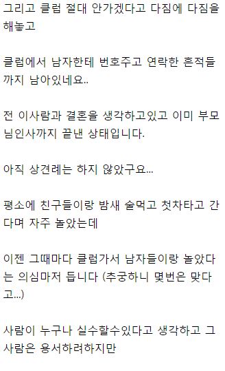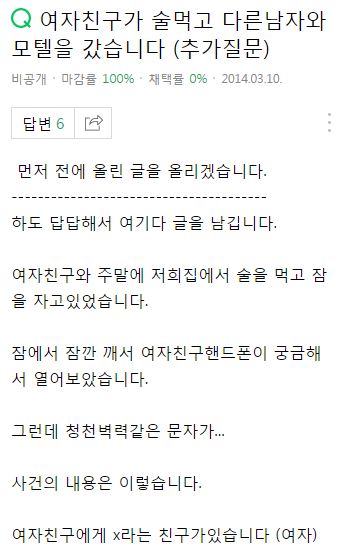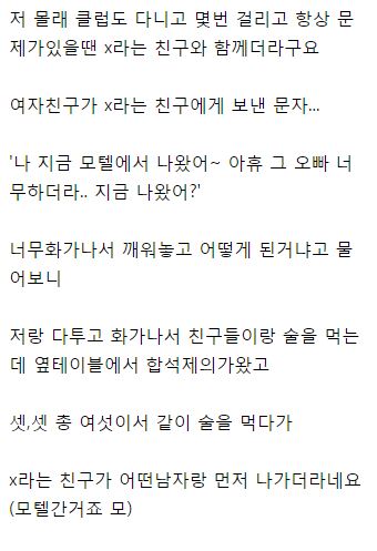 “결혼을 약속한 여친이 클럽가서 ‘합석’하고 그 남자와 ‘모텔’에서 잤습니다” ADVERTISEMENT 결혼을 약속한 사이의 연인이라면 그만큼 서로에게 신뢰가 깊을 것이다. 하지만 그 신뢰에 금이 가면 산사조각이 나는 건 시간 문제다. 과거 온라인 커뮤니티에 믿었던 여자친구가 다른 남자와 모텔을 갔다는 사연이 큰 화제를 모았다. ADVERTISEMENT 이를 본 네티즌들은 분노의 답변을 달았다. ADVERTISEMENT 온라인 커뮤니티