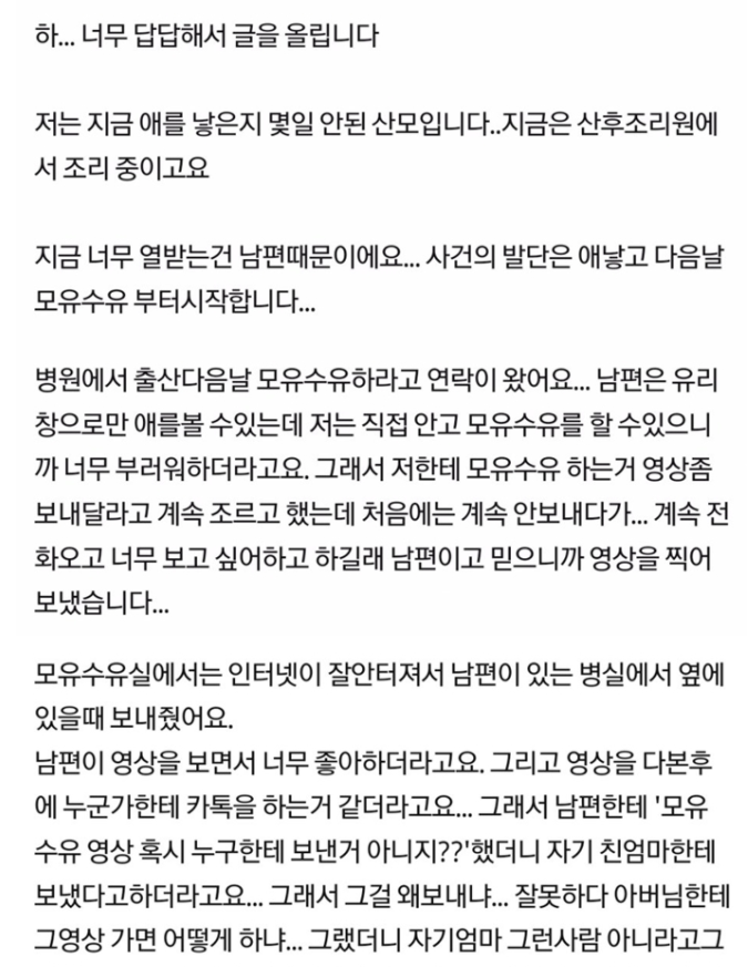 이어 “저는 지금 애를 낳은지 몇일 안된 산모입니다.. 지금은 산후조리원에서 조리 중이고요..”라며 “지금 너무 열받는건 남편때문이에요.. 사건의 발단은 애낳고 다음날 모유수유부터 시작합니다”라며 사건의 개요에 대해 설명했다.