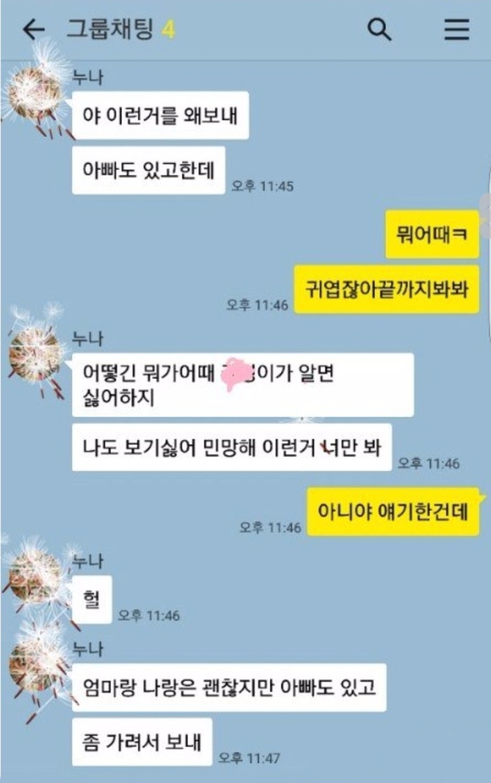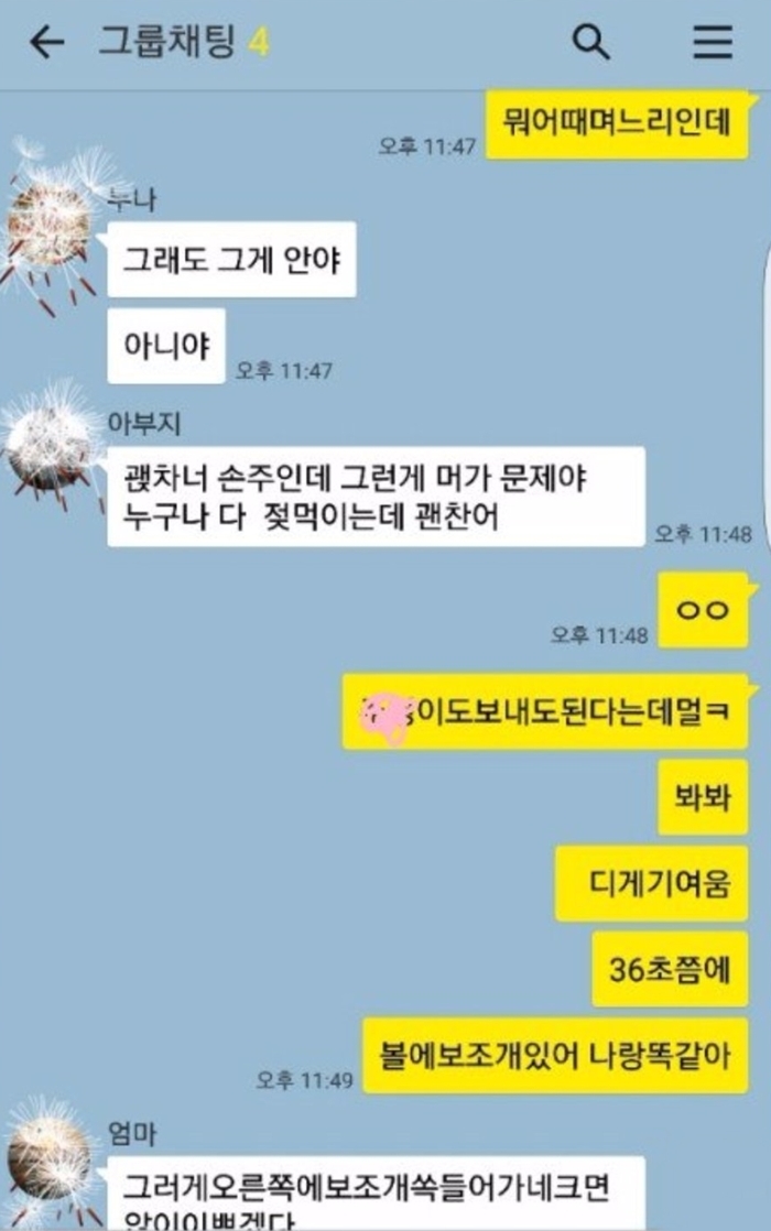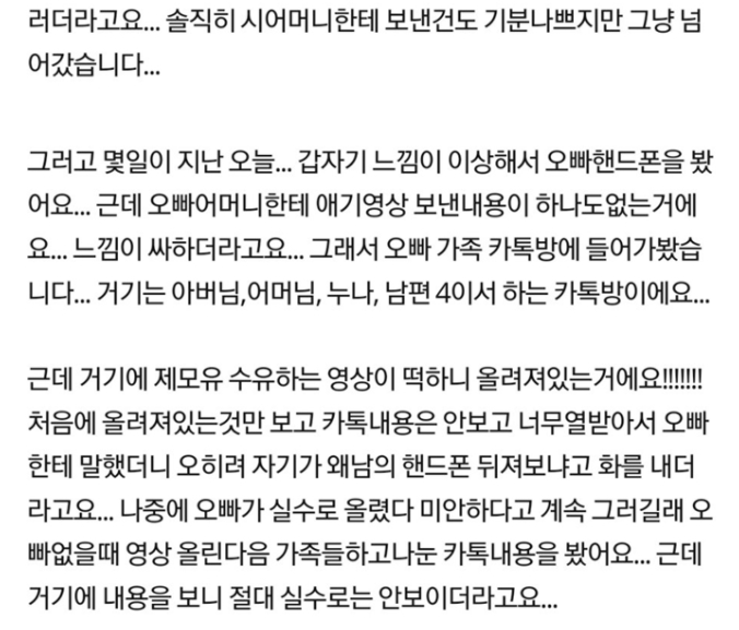 그리고 시간이 지나 보니 시아버님, 시어머님, 남편의 누나, 남편 4명이 함께 있는 카톡에 모유수유를 하는 영상을 공유했다고한다.