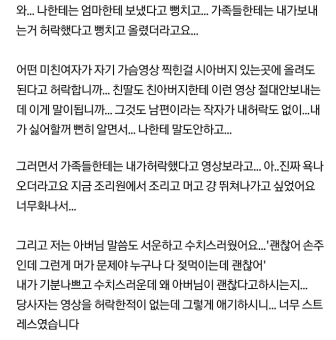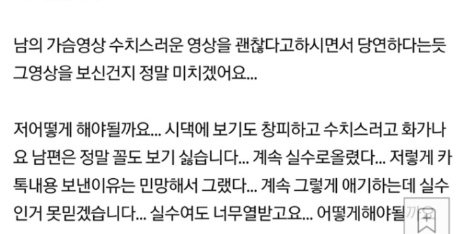 그래서 A씨에게 모유수유 하는 영상좀 보내달라고 계속 조르고 했지만 처음엔 거절하다 전화도 오고 너무 보고 싶어하길래 남편을 믿어서 영상을 찍어 보냈다고 한다.