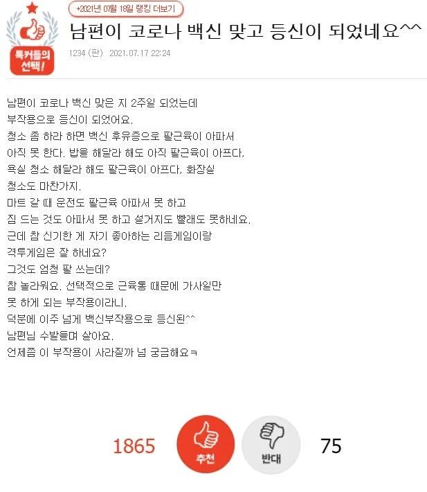 A씨는 “부작용으로 등신이 됐다. 청소 좀 하라 하면 백신 후유증으로 팔근육이 아파서 아직 못한다고 한다”고 전했다.