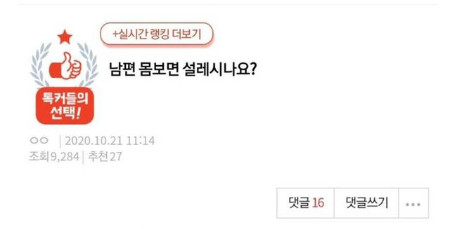 한 온라인 커뮤니티에는 “남편 몸보면 설레시나요?”라는 제목의 글이 올라와 누리꾼들 사이에서 화제가 되고 있다.