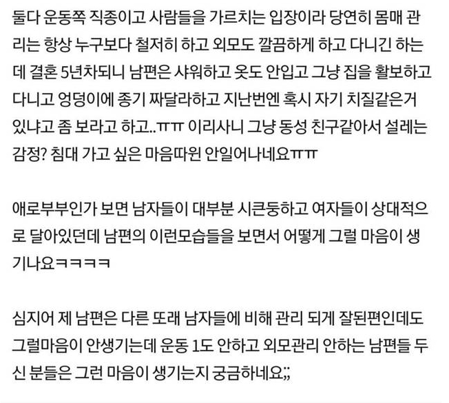이어 “제 남편은 다른 또래 남자들에 비해 관리 되게 잘된편인데도 그럴마음이 안생기는데 운동 1도 안하고 외모 관리 안하는 남편들 두신 분들은 그런 마음이 생기는지 궁금하네요”라고 물었다.