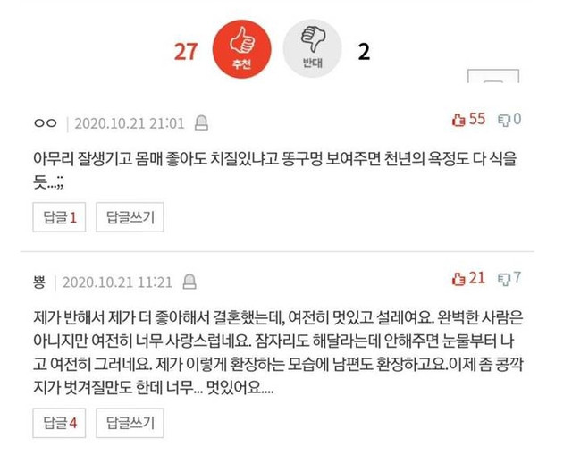 그는 “에.로.부부 인가 보면 남자들이 대부분 시큰둥하고 여자들이 상대적으로 달아있던데 남편의 이런 모습을 보면서 어떻게 그럴 마음이 생기나요”라고 말했다.