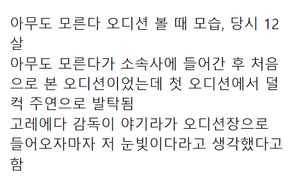 어릴 때 친구가 아역배우로 활동하는 것을 보고 자신도 해보고 싶어서 스타더스트 프로모션에 들어가게 되었다고 한다.