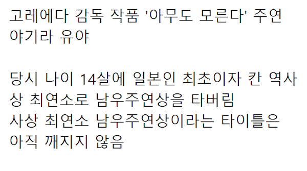 이때 생애 처음으로 본 오디션이 영화 <아무도 모른다>였는데 2004년 영화 <아무도 모른다>로 데뷔하여 역대 최연소(14세)로 57회 칸 영화제 남우주연상을 수상하였다.