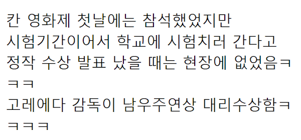 하지만 중간고사 기간과 겹쳐 시상식에 참석하지 못했기 때문에어마어마한 상을 직접 받지는 못했다. 수상을 발표하는 순간에는 자고 있었다고 전해졌다.