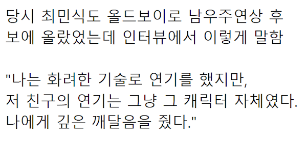 당시 남우주연상 경쟁 상대 중 하나가 무려 영화 올드보이의 최민식이었다는 사실.