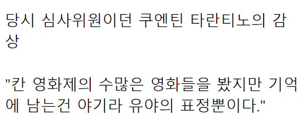 심사위원이었던 쿠엔틴 타란티노는 많은 영화를 봤지만 잊혀지지 않는 건 야기라 유야의 얼굴이었다고 평하기도 했다.