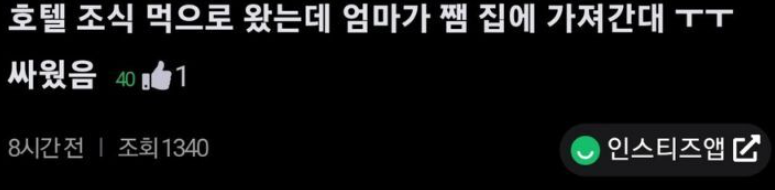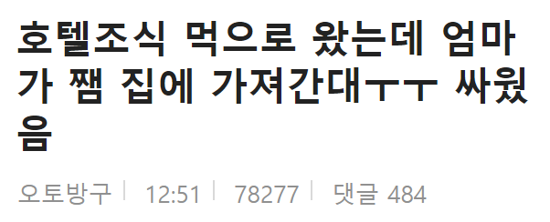최근 한 국내 온라인 커뮤니티에 ‘호텔 조식 먹으러 왔는데 엄마가 쨈 집에 가져간대 ㅜㅜ 싸웠음’이라는 제목의 게시글이 올라와 네티즌들 사이에서 갑론을박이 펼쳐졌다.