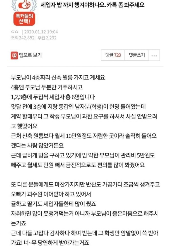 ‘집주인이 세입자 밥까지 챙겨야 하나요’라는 제목의 글이 올라왔는데 사연은 매우 황당하다.