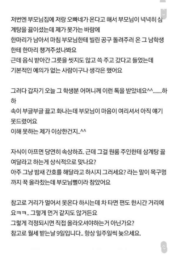 그러던 어느날 A씨의 부모님은 삼계탕을 부족하지 않게 넉넉하게 만들었고 마침 한 마리가 남았길래 볼 일 있는 문제의 남학생에게 한 마리를 선뜻 베풀었다고 한다.
