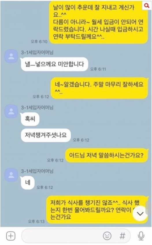 이런 문자를 받은 부모님은 “저희가 식사를 챙기지 않는다”며 “식사했는지 한 번 물어봐드릴까요? 연락이 안되는 건가요”라고 물었다고 한다.