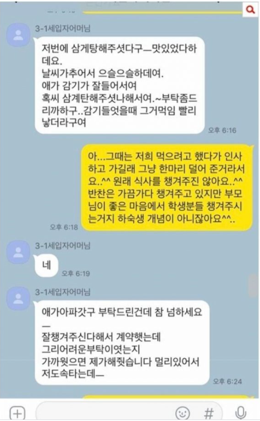 이에 문제의 남학생 엄마는 “저번에 삼계탕 해주셨다고 들었는데 혹시 삼계탕 해주셨나해서요”라는 문자를 했다고 한다.