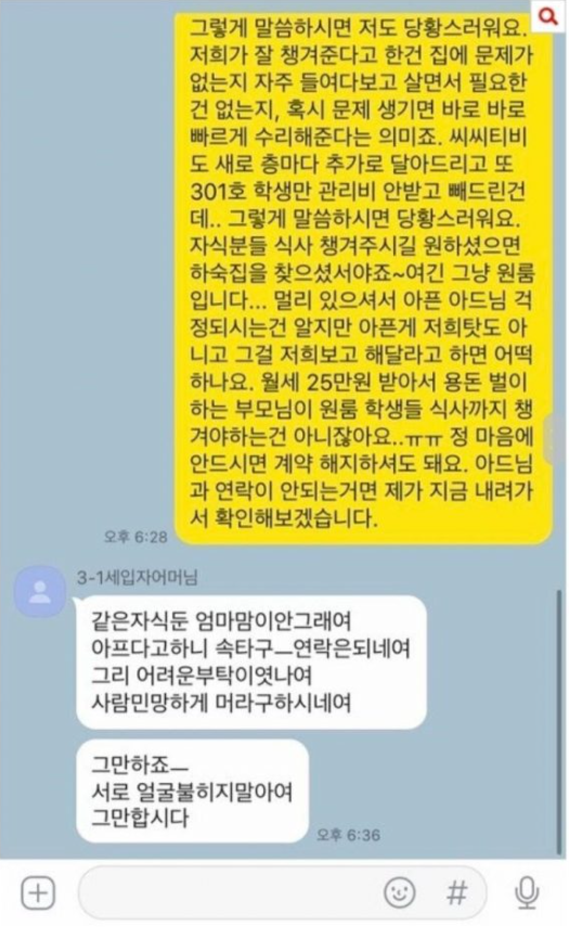 그리고는 “애가 아파서 부탁드린건데 참 너무하신다”며 “잘 챙겨주신다해서 계약했는데, 사람 민망하게 뭐라고 하시네요”라면서 호의를 베푼 집주인에게 생색을 내면서 섭섭하다며 원망하는 말투로 문자를 보냈다고 한다.