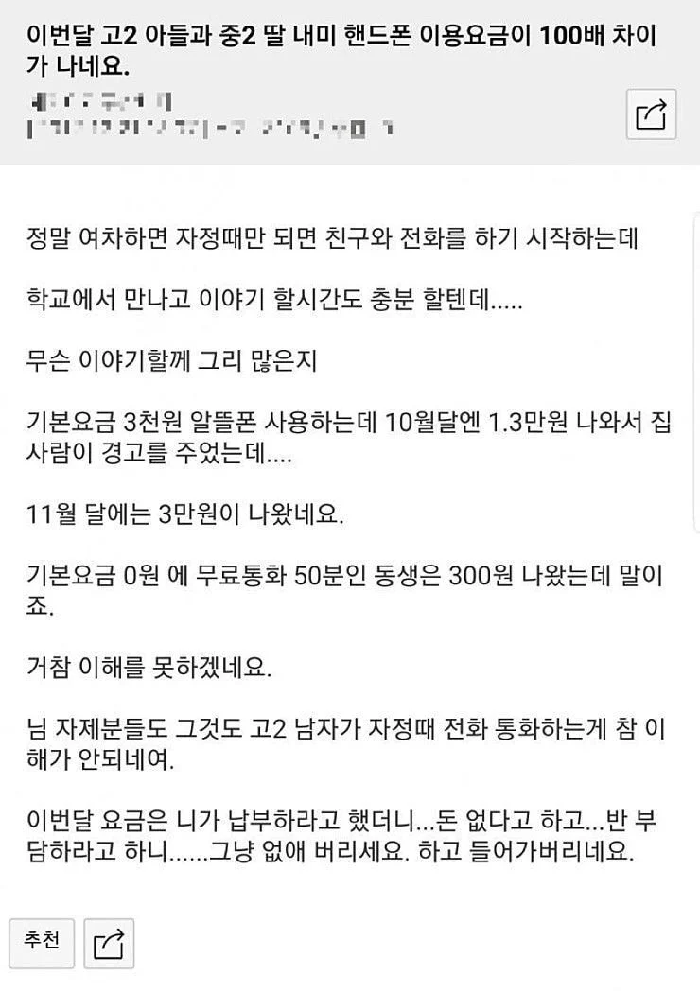 지난 14일 한 온라인 커뮤니티에서는 “이번 달 고2 아들과 중2 딸 핸드폰 이용요금이 100배 차이가 난다”는 글이 큰 화제를 모았다.