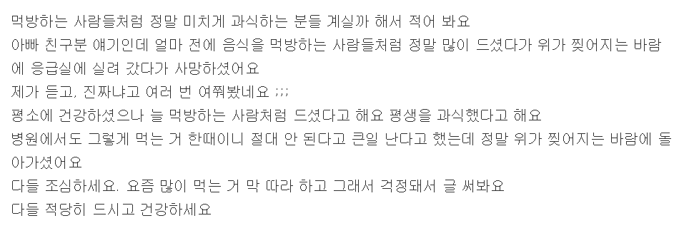 큰일난다’고 했는데 정말 위가 찢어지는 바람에 돌아가셨어요”라고 했다. 끝으로 “다들 조심하세요. 요즘 많이 먹는 거 막 따라 하고 그래서 걱정돼서 글 써요. 다들 적당히 드시고 건강하세요”라며 당부했다.