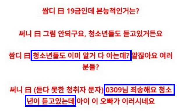 결국 써니는 “0309님 죄송해요. 청소년이 듣고 있는데…”와 같이 사과를 했다.