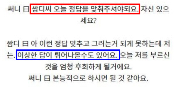 써니가 쌈디에게 정답을 맞출 수 있냐고 묻자, 쌈디는 “이상한 답이 튀어나올 수 있다”고 말했다.
