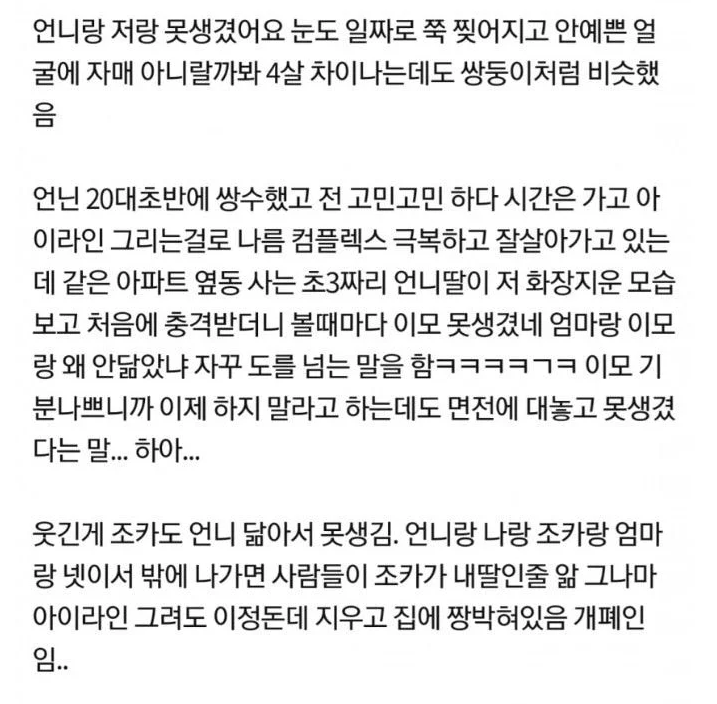 그런데 언니 딸인 조카의 도 넘은 외모 지적에 A씨가 폭발한 것. A씨 조카는 A씨가 화장을 지운 모습을 보고 만날 때마다 “이모 못생겼네”, “엄마랑 이모는 왜 안닮았냐”고 말했다.