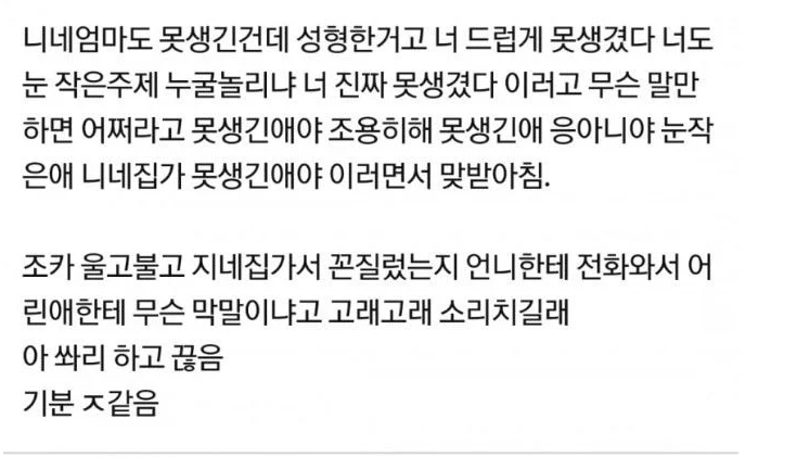 이에 A씨가 “기분 나쁘니까 이제 하지마”라고 주의를 준 후에도 대놓고 못생겼다며 놀렸다. 조카의 행동에 화가 난 A씨는 “너네 엄마도 못생겼는데 성형했다. 너도 못생겼다. 너도 눈 작으면서 누굴 놀리냐”며 맞받아쳤다.