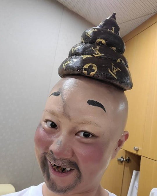 박나래의 사진을 보면 대머리와 수염 등 분장을 하고 머리에 똥모양의 모형을 올리고 있었다.