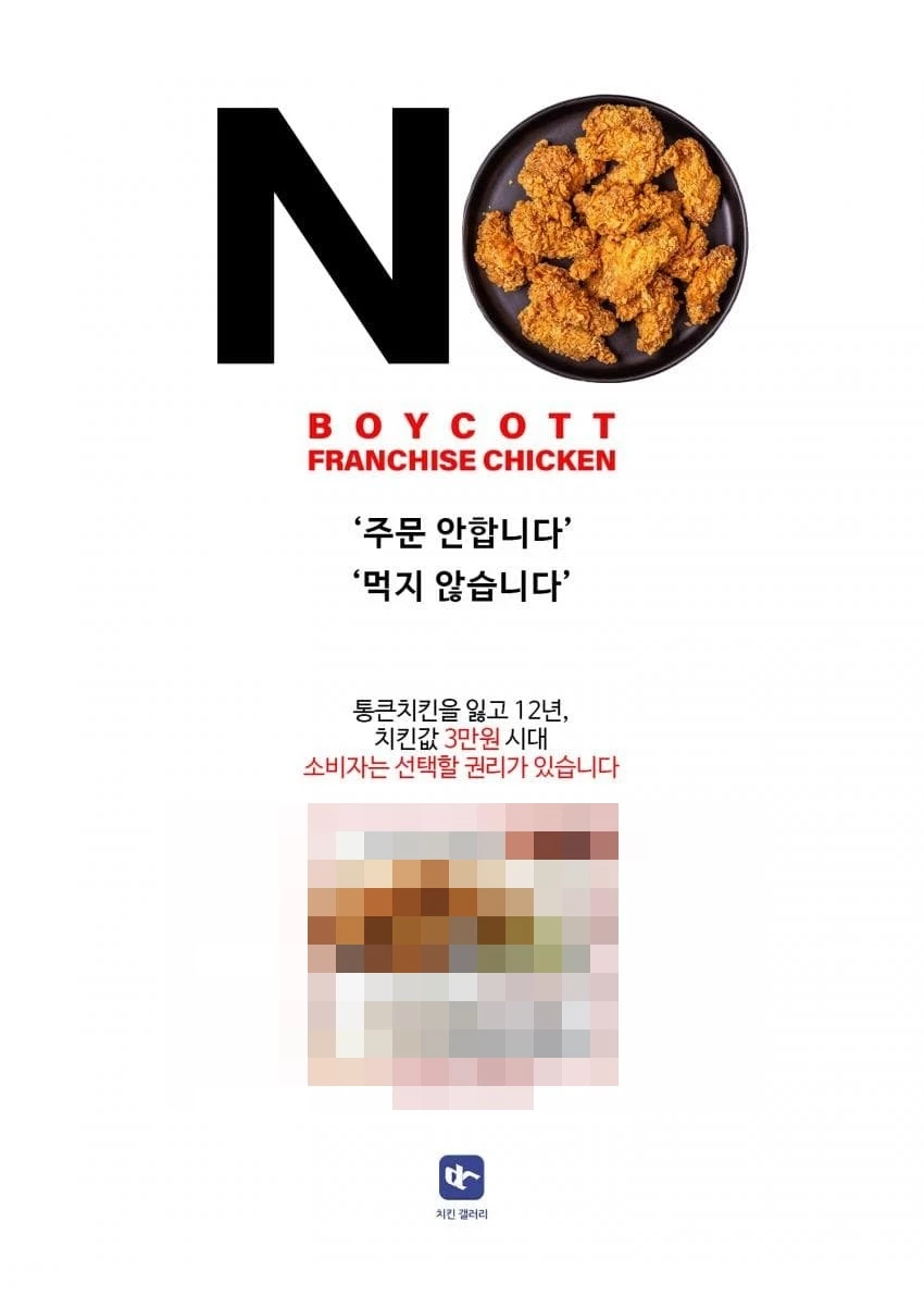 한 온라인 커뮤니티 치킨 갤러리는 지난 17일 2019년 일본상품 불매 운동 당시의 포스터를 패러디한 치킨 불매운동 이미지를 배포하며 치킨 프랜차이즈 보이콧 의사를 밝힌 게시물을 게재했다.