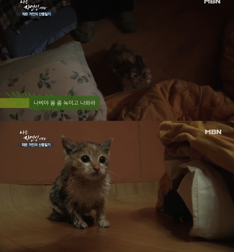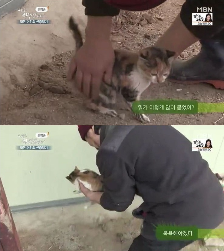 자연에서 온몸에 이거저거 다 묻은 고양이를 발견한 자연인.