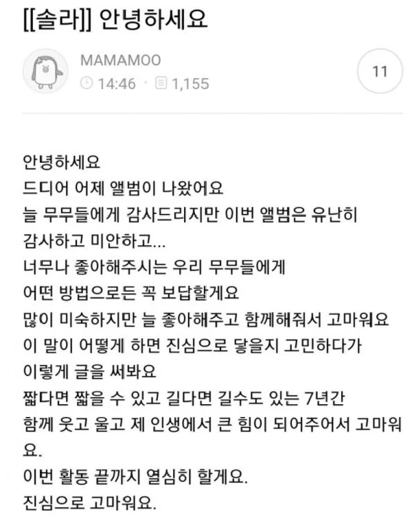 걸그룹 마마무 멤버 솔라가 올린 글에 관심이 쏠리고 있다.