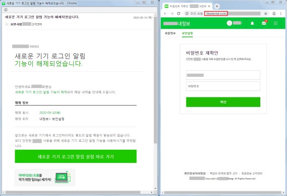 ESRC가 포착한 이번 공격은 국내 유명 포털 보안 서비스 중 하나인 ‘새로운 기기 로그인 알림 기능’이 해제됐다는 이메일 공지를 사칭하고 있다.