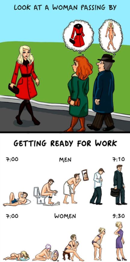 남성은 길거리에 지나가는 명품 입은 여자를 보든 어떤 옷을 입은 여자를 보든 알몸을 상상하는 편이 많지만, 여성은 저 옷 얼마지..? 저 구두 얼마지..? 가방 짭인가? 등의 반응을 한다.
