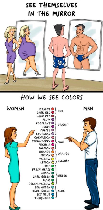 여성이 색을 보는 것은 엄청 세세하고 톤마다 이름을 달달 외운다. (화장 영향이 큼)