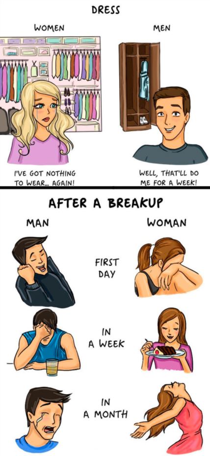 남성은 헤어지자마자 해방감을 느끼고 못했던 롤, 오버워치, 배그, 술자리 등 하고 싶었던 것을 그냥 단순히 하고 여성은 반대로 초반부터 눈물을 흘리며 슬퍼한다.