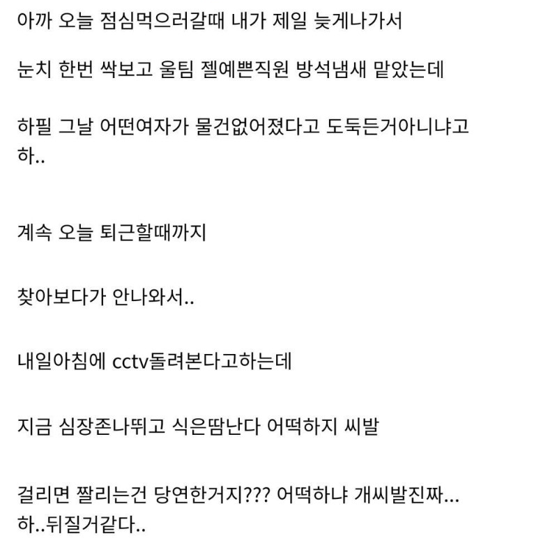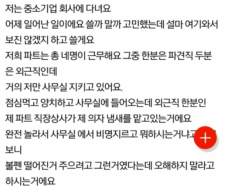 모두 퇴근하고 혼자 사무실에 있다가 충동적으로 해당 여직 원이 앉았던 의자의 냄새를 맡았습니다.