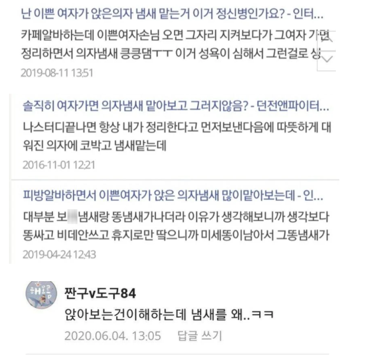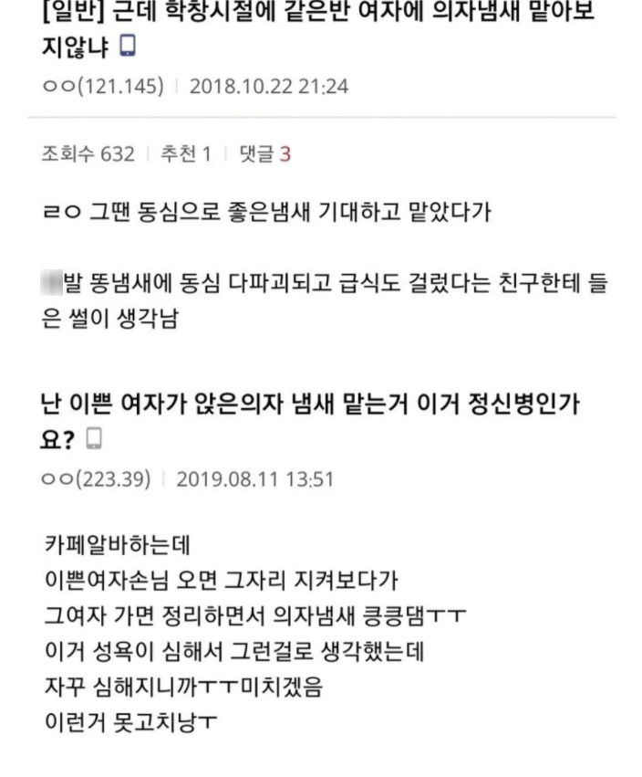 한 온라인 커뮤니티에 올라온 같은반 여학생의 의자냄새를 맡아봤다는 남성