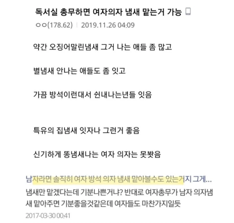 또 독서실 총무하면 여자의자 냄새 맡는거 가능하다며 올린 글