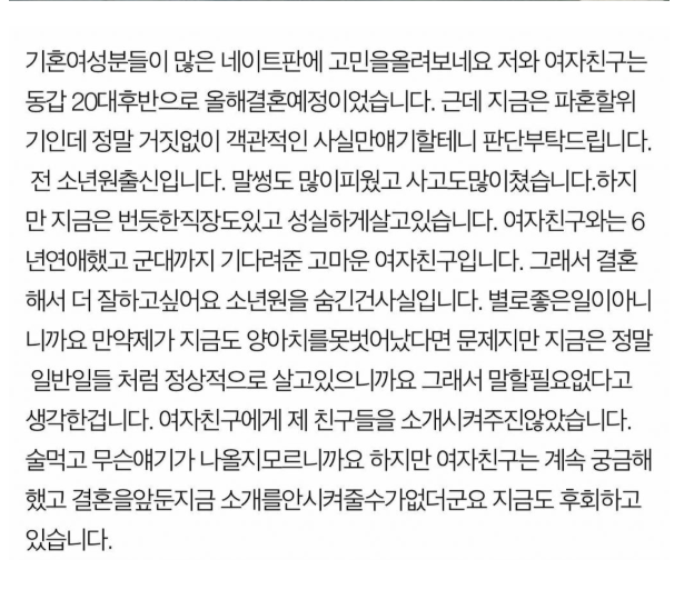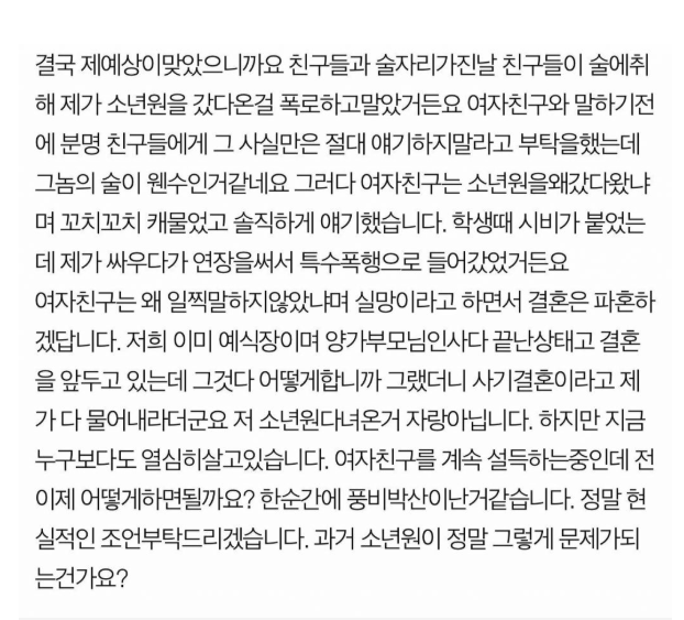 그래서 그는 여자친구와 결혼까지 생각하고 있는데 소년원을 다녀온 사실을 숨겼다고 한다.