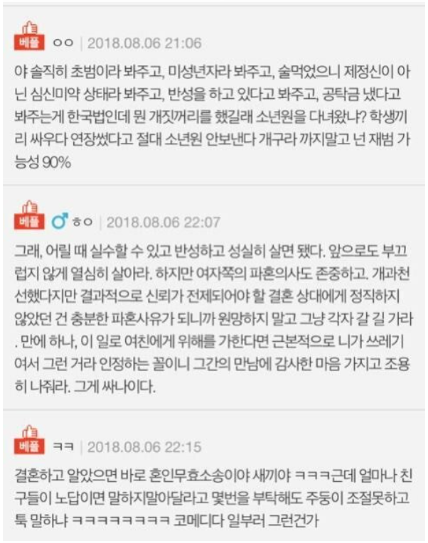 그렇게 결혼식은 무산되었고 누리꾼들에게 소년원을 갔다온 것이 그렇게 잘못한 것이냐고 조언을 구했다.