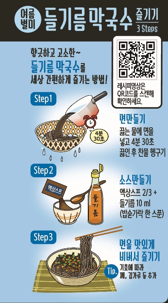 해당 레시피를 접한 누리꾼들은 “나의 여름 입맛을 책임진 들기름 막국수”, “깨소금에 김까지 넣으면 내가 알던 막국수 맛임ㅠㅠ”라며 다양한 반응을 보이고 있다.