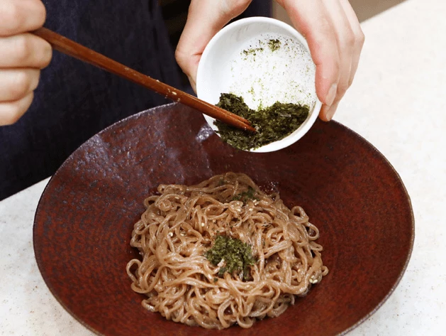 농심의 메밀소바를 활용해 들기름 막국수를 만드는 법은 간단한데 첫 번째로 끓는 물에 면을 넣고 약 4분 30초간 끓인 후 찬물에 헹군 뒤 소스는 제품에 들어있는 액상스프 ⅔와 들기름 10ml를 함께 섞어주면 된다.