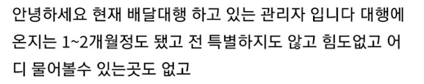 어떤 가맹점은 픽업 후 10분 안에 배달해라 어느 곳은 배차 후 픽업시간 1분도 늦지 마라 어떤 곳은 배취도 불가능 했습니다. 이게 저희 입장이구요 죄송합니다.