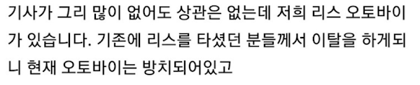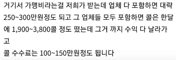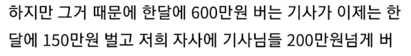 600만 원을 버시는 분이 현재 150만원 밖에 벌지 못한다는게 150만 원으로 떨어졌다는게 매출 자체는 150만원이 아니고 리스비랑 수수료 때면 수익 150만원 정도입니다 리스비 하루에 3만6천원이구요 그것도 제가 잘못 적은 부분이니 죄송하게 생각합니다.